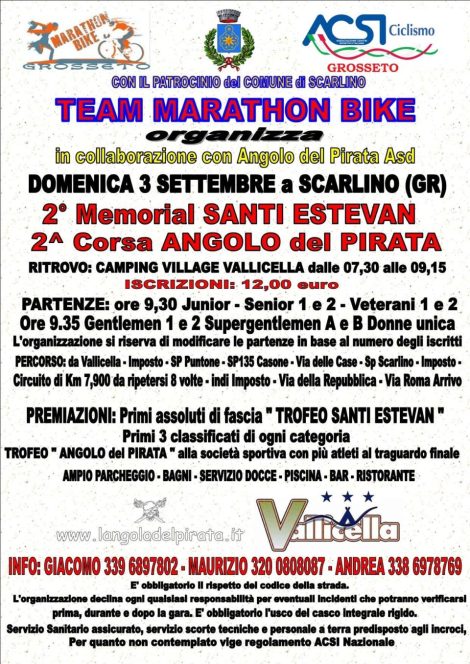 Scarlino (GR). Sarà domenica 3 settembre e non di mercoledì come lo scorso anno, il 2° Memorial Santi Estevan, 2^ Corsa Angolo del Pirata, organizzata dal Team Marathon Bike, in collaborazione con l’Asd Angolo del Pirata e ACSI settore ciclismo di Grosseto. La gara si svolgerà come sempre, nel circuito sottostante il borgo medievale maremmano, sovrastato dalla Rocca Aldobrandesca, teatro dell’arrivo della gara dello scorso anno. Luogo di ritrovo per le iscrizioni, è il Camping Vallicella, situato ai piedi della salita iniziale, dove i giudici Acsi vi attenderanno dalle ore 7,30 alle ore 9,15 circa. Per coloro che sono interessati a trascorrere il weekend in maremma fin da sabato 2 settembre, il campeggio offre a prezzo agevolato, il pernottamento nei bungalow mediante prenotazione contattando Giacomo al 339 6897802. Ecco sottostanti i vincitori della scorsa edizione, a sinistra premiato dalle Miss, Massimo Di Franco e a destra Giacomo Sansoni.