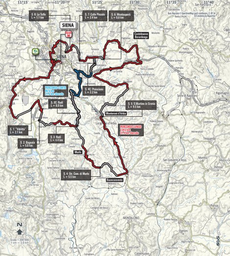Il tracciato del percorso Gran Fondo sarà pressoché identico a quello della prova femminile (3 km in più, non viene calcolato il trasferimento al km 0), mentre quello Medio Fondo di 86,6 km prevede sei settori di strade bianche per un totale di 21,6 km di sterrato.