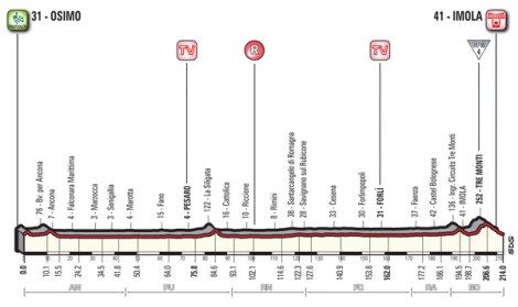Tappa completamente pianeggiante che percorre per la sua quasi interezza la ss16 Adriatica. Su strade larghe e sostanzialmente rettilinee i primi 130 km. Seguono altri 60 km sempre praticamente diritti lungo la ss9, Via Emilia, che attraverso Santarcangelo di Romagna, Cesena e Forlì porta a immettersi nel circuito automobilistico di Imola e al giro finale sul circuito dei “Tre Monti”.