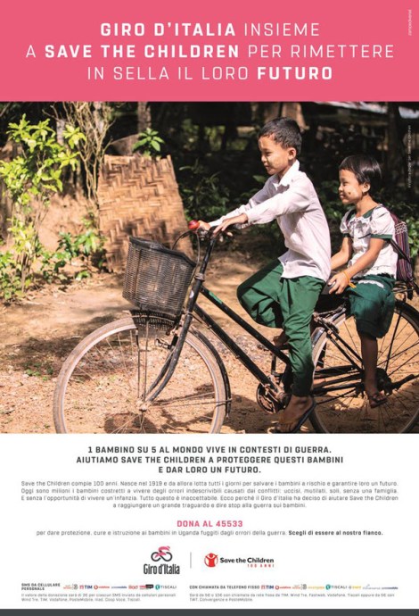 L’Organizzazione sarà infatti presente come Charity partner del Giro d’Italia, per sensibilizzare il pubblico attraverso un gesto simbolico: corridori, organizzatori, giornalisti, pubblico potranno apporre su un telo l’impronta della propria mano per dire “Stop alla guerra sui bambini”, quale segno del supporto del Giro d’Italia alla campagna globale di Save the Children, l’Organizzazione che da 100 anni lotta per salvare i bambini a rischio e garantire loro un futuro.