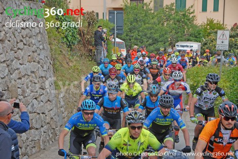 Dopo la partenza il gruppo inizia ad arrampicarsi sulla prima e lunga salita, quella che porta al Gpm denominato “La Garitta”. Le pendenze oltre il 23% allungano subito il gruppo che procede in fila indiana a velocità sostenuta, nonostante, appunto, le pendenze a due cifre.