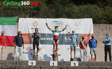 Poi Marco Aurelio Fontana ha saggiamente amministrato la situazione, anche se nell’ultimo giro Fruet spianato sulla sua bici ha cercato l’aggancio, ma invano. Fontana è arrivato impennando sul traguardo con soli 3”, sufficienti però per vestirlo in tricolore. Bella stretta di mano tra i due, con Martino Fruet a ricordare che Fontana se l’era ritrovato davanti sul podio ai Campionati Italiani di Pejo. Per il terzo posto, dal secondo giro in poi Vittorio Gambirasio ha gestito la corsa con grande autorità. Dietro è finito l’ex pro su strada Riccardo Chiarini e quindi il redivivo Mirko Pirazzoli.