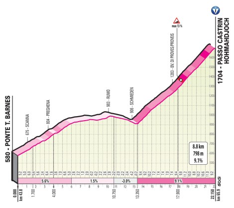 Tappone alpino che in quattro salite presenta un dislivello notevole che porta la tappa a circa 5400 m. Partenza in salita sul Passo Campo Carlo Magno che porta in Val di Sole e dopo circa 45 km si affronta l’inedito (strada di apertura recentissima) Passo Castrin/Hofmahdjoch che porta in Val d’Ultimo/Ultental. La lunga discesa su strade ampie, ben pavimentate serpeggianti a mezza costa porta ai sobborghi di Merano dove si riprende a salire da Foresta/Forst entrando in Val Venosta e risalendola quasi per intero. Si affronta quindi lo Stelvio (2758 m) dal versante più impegnativo (quasi 25 km al 7.5% di cui metà oltre i 2000 m) e quindi immediatamente dopo la lunghissima discesa (numerose brevi gallerie nella parte centrale) la salita finale ai laghi di Cancano con le “scale di Fraele” e i loro ventuno tornanti perfettamente ritmati sul fianco della montagna.