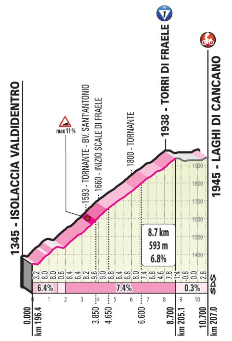 La salita finale di quasi 9 km attorno al 7% porta alle Torri di Fraele, circa a 2 km dall’arrivo. Seguono due brevi gallerie e una breve discesa fino al Lago delle Scale, che si costeggia per circa 1 km perfettamente pianeggiante. Gli ultimi 500 m sono in leggera salita al 3.5 % circa. Rettilineo finale di 200 m in asfalto largo 6.5 m.