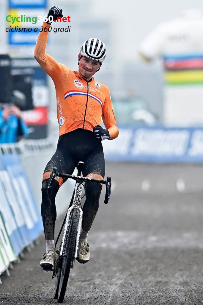 Davanti Mathieu Van der Poel ha risettato bene la testa e super concentrato guadagna fino a 30″ sul Wout Van Aert che ormai vede svanire il sogno del suo quarto titolo iridato. Van der Poel taglia per primo il traguardo e veste per la terza volta consecutiva (quarta in carriera) la maglia arcobaleno di Campione del Mondo di Ciclocross 2021. Il terzo scalino va a Ton Aerts che nel frattempo si era di nuovo scambiato di posizione con Pidcock a cui rimane la medaglia di legno.