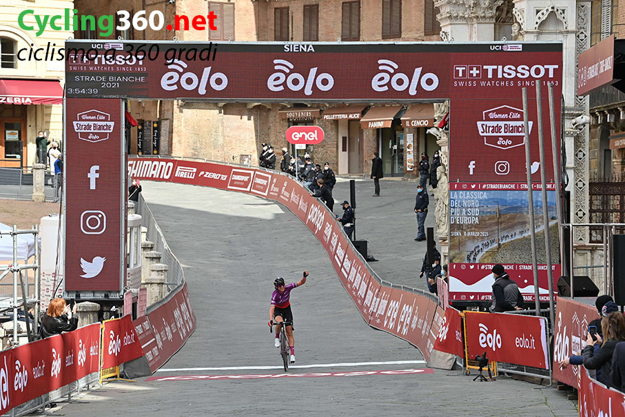 Siena, 6 marzo 2021 – Chantal van Den Broek-Blaak (Team Sd Worx) ha vinto la settima edizione della Strade Bianche Women Elite Eolo, da Siena a Siena (Piazza del Campo) di 136 km. Sul traguardo finale nella storica piazza ha preceduto la campionessa italiana Elisa Longo Borghini (Trek – Segafredo) e Anna van Der Breggen (Team Sd Worx).
