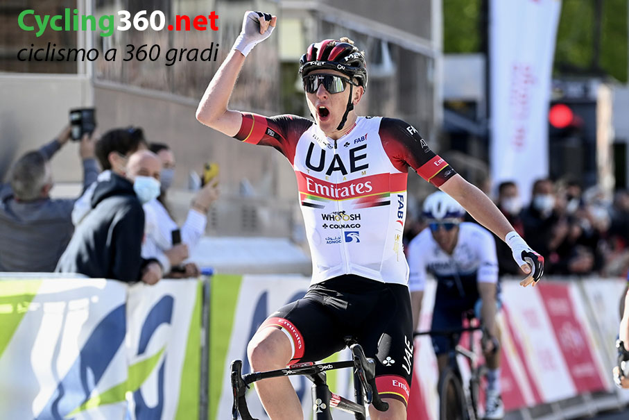 I fuggitivi sono Laurens Huys, Mathijs Paasschens (Bingoal Pauwels Sauces WB), Loic Vliegen, Lorenzo Rota (Intermarché-Wanty-Gobert Matériaux), Sergei Chernetsk (Gazprom-RusVelo), Tomasz Marczynski (Lotto Soudal) e Aaron Van Poucke (Sport Vlaanderen–Baloise), che guadagnano fino a un massimo di 10′. La situazione in gruppo si anima sul Col du Rosier (4,4 km con una pendenza media del 5,9%) dietro la spinta in particolare di Guillaume Martin (Cofidis) anche se a fare il vuoto sono Mark Padun (Bahrain Victorious), Mark Donovan (Team DSM) e Harm Vanhoucke (Lotto Soudal). La corsa esplode sulla Cote de la Redout (2 km con una pendenza media dell’8,9% e massima del 13%): davanti restano i soli Huys, Rota, Marczynski e Vliegen, con quest’ultimo che poi si invola in solitaria prima di doversi fermare per un guaio muscolare, mentre dietro il forcing portato da Tao Geoghegan Hart e Adam Yates (Ineos Grenadiers) screma il plotone, con anche Primoz Roglic (Jumbo-Visma) alle prese con un momento di difficoltà. Lo squadrone britannico insiste nella sua azione sulla Cote des Forges (1,3 km con una pendenza media del 7,8%) e spacca ulteriormente il plotone dei migliori, che intanto ha annullato la fuga: il nuovo leader della corsa diventa Richard Carapaz, che viene però raggiunto sulla Cote de la Roche-aux-Faucons (1,3 km con una pendenza media dell’11% e massima del 13%). Le rampe più dure risultano fatali per Roglic ma non per Julian Alaphilippe (Deceuninck-Quick Step), David Gaudu (Groupama-FDJ), Tadej Pogacar (UAE Team Emirates), Alejandro Valverde (Movistar) e Michael Woods (Israel Start-Up Nation). E’ questo quintetto a giocarsi la vittoria, che va a Pogacar, protagonista di una svolata maestosa che beffa il grande favorito Alaphilippe, per cui la Liegi resta un tabù.