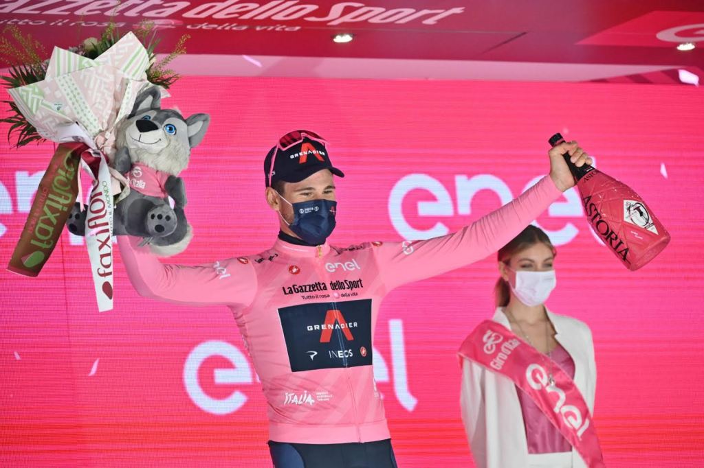 La maglia rosa simbolo della ripartenza dell’italia: indossata da un italiano con il logo di Italia-Enit agenzia nazionale del turismo.Enit-Agenzia Nazionale del Turismo firma la maglia rosa del Giro d’ Italia indossata oggi da un Italiano, Filippo Ganna che conserva il titolo. La classifica generale ha visto Remco Evenepoel guadagnare ben 3 posizioni grazie ai 2 secondi di abbuono al traguardo volante, dove il belga è giunto 2° alle spalle di Ganna (che dunque ha conquistato 3″, mentre Moscon ha incamerato 1″ con il 3° posto).