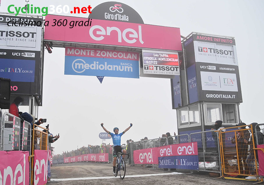 Monte Zoncolan, 22 maggio 2021 – Lorenzo Fortunato (Eolo-Kometa Cycling Team) ha vinto la tappa 14 del centoquattresimo Giro d’Italia, la Cittadella – Monte Zoncolan, di 205 km. Al secondo e terzo posto si sono classificati rispettivamente Jan Tratnik (Bahrain Victorious) e Alessandro Covi.