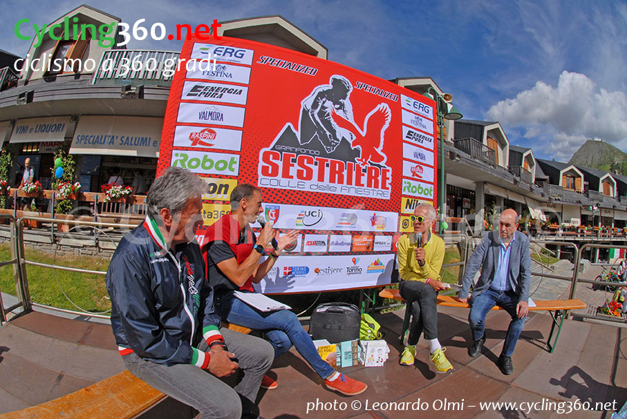 Mentre la Conferenza Stampa si è tenuta all’aperto, sempre in Piazza Fraiteve, proprio sul palco dove alla domenica sarebbero andate in scena le premiazioni di tutte le categorie, compresa quella dei giornalisti. Alla conferenza non poteva mancare il Sindaco di Sestriere, il Presidente della AGCI (Ass. Giornalisti Ciclisti Ita.) Roberto Ronchi ed il collega Paolo Viberti che ci ha fatto sognare con i suoi racconti sulle imprese epiche di Coppi e Bartali fino a quelle che, appunto, hanno compreso Di Luca e Froom sul Colle delle Finestre.