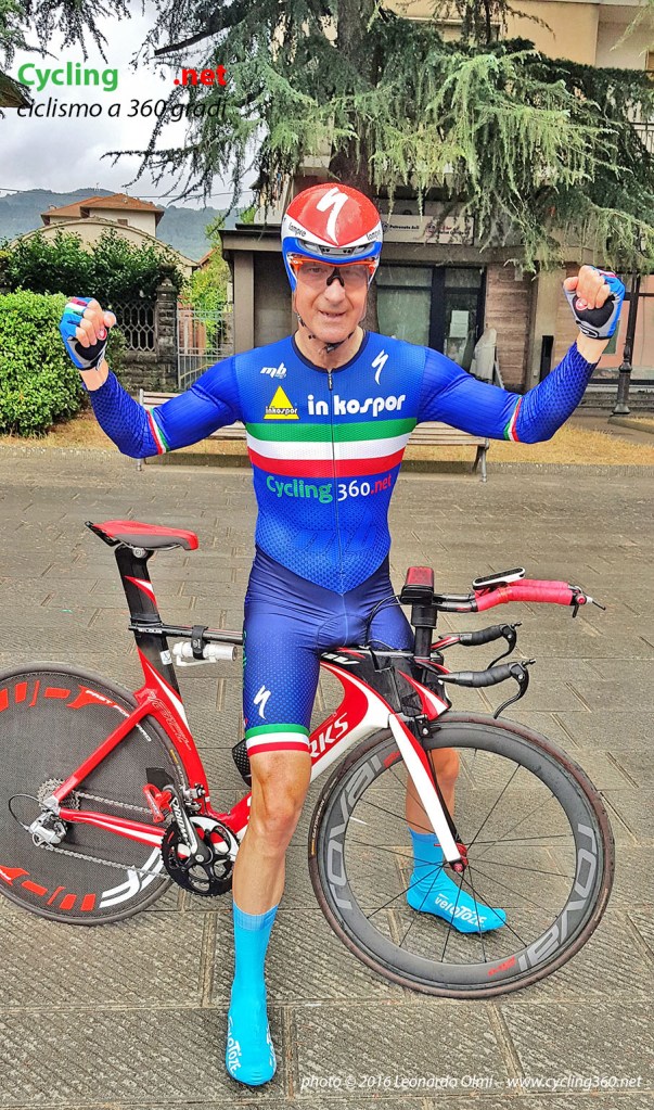 Con la conquista di due titoli italiani il nostro Leonardo Olmi (Cycling360.net) ha dato una bella soddisfazione anche alla sua squadra, la Cicli Taddei di Santa Croce sull’Arno, ed i suoi supporters: Inkospor per l’integrazione Sportiva ed MB-Sport – Think+ di Agliana (PT) per l’abbigliamento tecnico sportivo, che per l’occasione aveva fatto proprio un body da crono speciale.