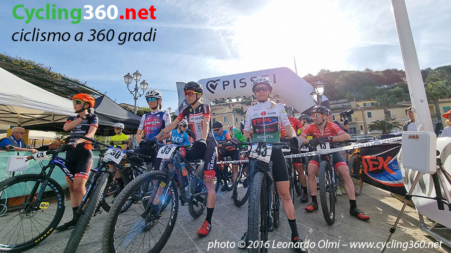 Quindi, la mattina della gara, faccio anch’io un’abbondante colazione che mi servirà per affrontare i 2500 metri di dislivello, prendo la bici e mi dirigo a Porto Azzurro. Una volta arrivato piazzo la mia bici in griglia in griglia per poi andare a fare subito qualche scatto ai professionisti delle ruote grasse.
