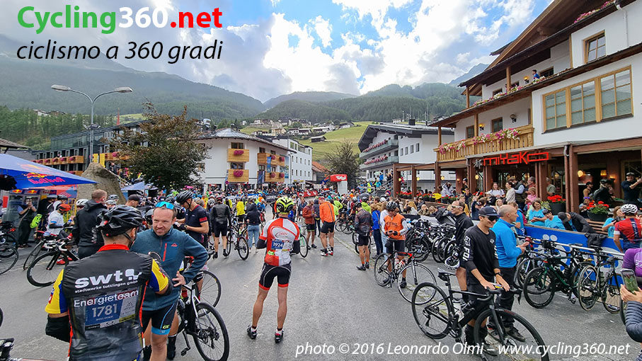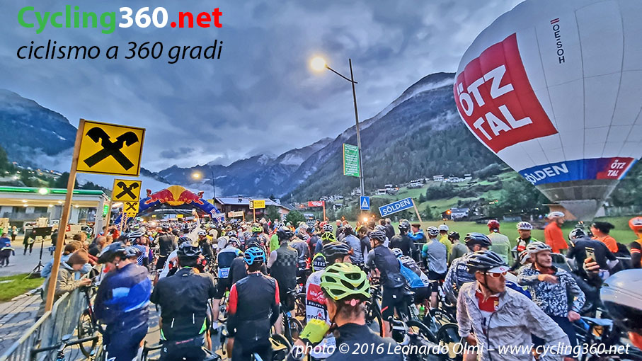 Una giornata fatta da panorami mozzafiato, colorati dal verde di boschi e prati e dal grigio delle vette alpine con le mucche in mezzo di strada che attraversano da un prato all’altro, salutando il fiume colorato di ciclisti che ci circonda e ci dà il morale necessario per andare avanti. Ognuno di noi sicuramente pensa: “se ce la fa lui o lei, perché non dovrei farcela anch’io?”, e così si va avanti per chilometri e per ore. Tutti, dal momento che si schierano alle prime luci dell’alba sotto lo striscione della RedBull lungo la Dorfstraße di Sölden, sanno che i chilometri da affrontare sono tanti e che le ore da stare in bici sono molte, per la maggior parte oltre le otto ore, per moltissimi oltre le dieci ore, e per qualcuno anche vicino alle 13 ore, con un tempo massimo da rispettare prima di affrontare l’ultimo passo di giornata, il Rombo.