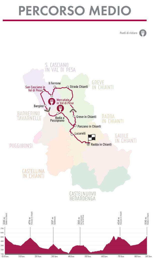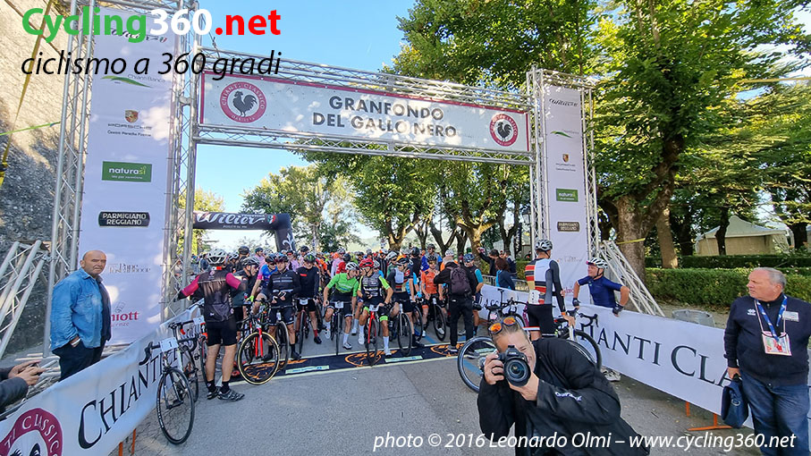 I ciclisti potevano scegliere tra due percorsi agonistici, ossia un Lungo di 135km per circa 2300mt-dsl e un Medio di 85km per circa 1500mt-dls; aventi tutti in comune la cornice unica del territorio di produzione del Gallo Nero, meta ogni anno di migliaia di cicloturisti provenienti da tutto il mondo. È stato molto bello vedere la maggioranza dei partecipanti che indossavano la maglia celebrativa delle passate edizioni, poiché quest’anno nel pacco gara, oltre alla classica bottiglia di vino, si trovava un’originalissima maglia in cotone con tre tasche dietro, stile eroica.