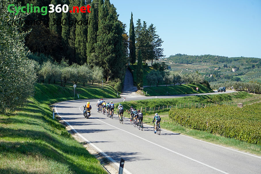 Ma tra queste colline spettacolari e uniche al mondo, apprezzate in particolar modo dai turisti stranieri, vanno su e giù un’infinità di strade e stradine con traffico pari a zero o quasi, tutte da scoprire, perfette per i ciclisti, che neanche io (che abito a pochi chilometri di distanza) conoscevo. Ancora una volta mi sono reso conto che nella nostra meravigliosa Toscana abbiamo a disposizione tutti i tipi di terreno, dalle salite dure ai vallonati e le pianure, anche se qui alla Gallo Nero, non ne ho viste neanche un metro. Forse è per questo che la Toscana è sempre stata terra di campioni di ciclismo.