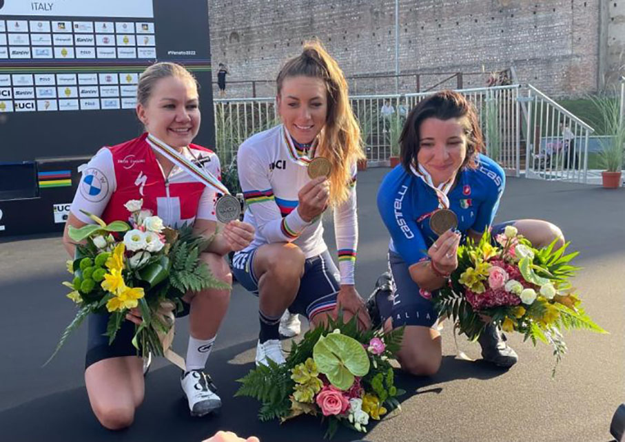 Lungo i 140 chilometri del tracciato che collegava Vicenza a Cittadella, con gli unici sobbalzi altimetrici subito dopo il via, la transalpina non ha sbagliato nulla. Impeccabile anche nella volata a due, che l’ha vista prevalere sulla biker svizzera Sina Frei, campionessa del mondo short track 2021 e argento nel cross country all’Olimpiade di Pechino, una che sullo sterrato sa il fatto suo. Distanziata di poco, ha ottenuto la medaglia di bronzo la bergamasca Chiara Teocchi, un’altra specialista degli sterrati, terza anche al campionato italiano Gravel.