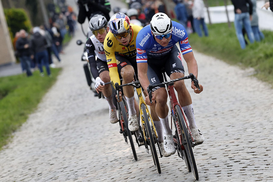 Sul secondo passaggio in salita sui ciottoli, la corsa è completamente andata in frantumi, sia tra i primi che nel gruppo. Dove un forte Trentin ha deciso di continuare nell’ora di punta della gara, un Pogačar scatenato è andato via sullo sfondo di tutto e di tutti, compresi Van der Poel e Van Aert. Tuttavia, l’olandese e il belga non erano ancora stati eliminati, e con l’aiuto di Christophe Laporte e Tom Pidcock hanno cercato di rientrare nella ruota di Pogačar. Quest’ultimo, tuttavia, non aveva intenzione di tenere ferme le gambe, sulla strada per il primo passaggio sul breve ma ripido Paterberg.