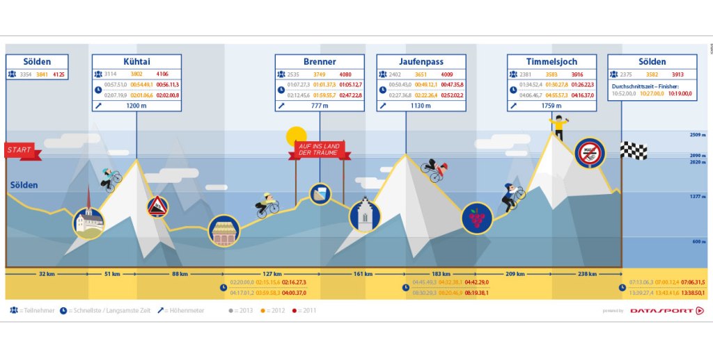 Partenza a Sölden alle 6:30, prevalentemente in discesa fino a Oetz (800 m). Poi salita fino al Kühtai (2.020 m). Si esce a Kematen e si prosegue in direzione Innsbruck (600 m). Salita al Brennero (1.377 m). Una breve pausa e poi discesa fino a Vipiteno (960 m). Salita regolare fino al Passo Giovo (2.090 m). Discesa cauta fino a San Leonardo in Val Passiria (700 m) e poi come gran finale il Passo Rombo (2.474 m) con discesa verso il traguardo di Sölden (1.377 m).