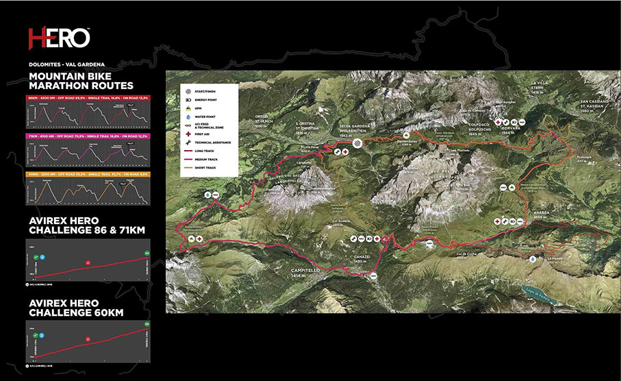 L’appuntamento con gli eroi è fissato per sabato 15 giugno 2024. Alle 7.10 lo sparo che darà il via alla gara regina, la maratona di mountain bike più dura al mondo: la HERO Südtirol Dolomites. Gli atleti si metteranno alla prova lungo i due iconici percorsi di gara, il “lungo” da 86km e 4.500 metri di dislivello, il “corto” da 60km e 3.200 metri di dislivello e il nuovo “medio” da 71km e 4.100m di dislivello. Quest’ultimo seguirà per gran parte l’itinerario del “lungo” ma andrà a escludere il passaggio ad Arabba della temuta salita dell’Ornella con i suoi 967 metri di dislivello. Da Arabba il percorso salirà direttamente al Passo Pordoi lungo il tracciato di 60 km, per proseguire poi su quello di 86 km fino all’arrivo a Selva Val Gardena.