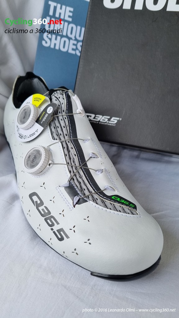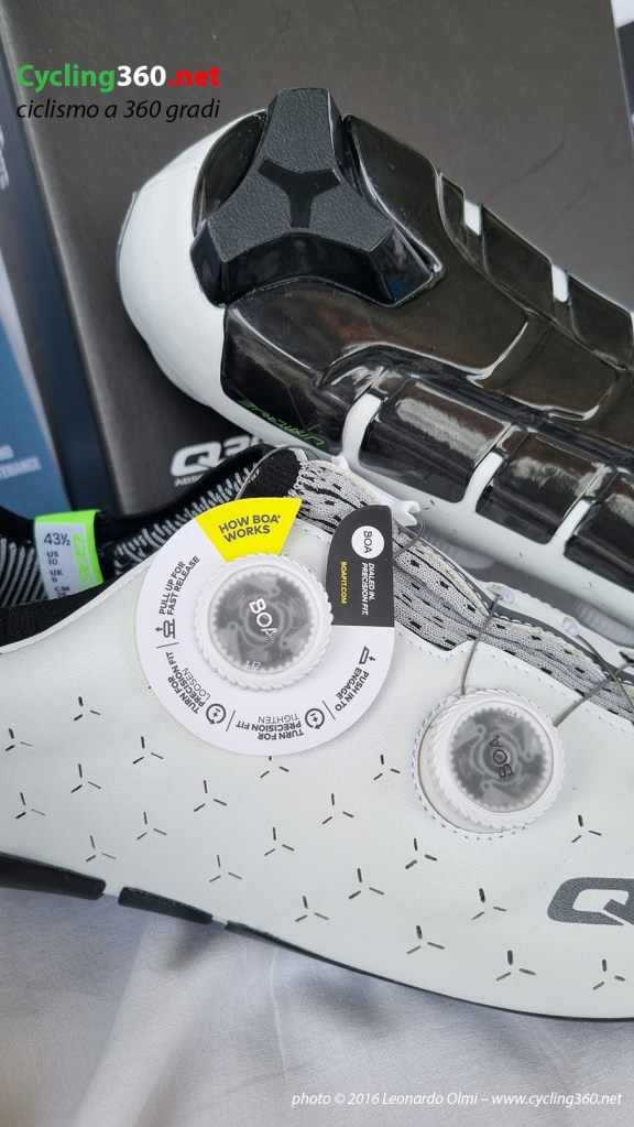 All’interno della tomaia, Q36.5 ha ideato un sistema di supporto per massimizzare il trasferimento di potenza avvolgendo il collo del piede. Il supporto Power Wrap circonda il collo del piede e mantiene il piede in posizione, fornendo un aiuto ergo genico durante la pedalata e assicurando zero sprechi di potenza. Questo è proprio ciò che ho notato durante le mie uscite dove ho alternato tratti di pianura, dove bisogna spingere in maniera ritmica ed uniforme, a quelli in salita dove alzandosi sui pedali dobbiamo trasferire la massima potenza anche durante una pedalata più ondulata rispetto alla pianura. Ed è proprio ciò che ho fatto dopo aver dato il classico giro di vite al Boa prima di alzarmi sui pedali. Davvero un’ottima reazione Forza-Potenza.
