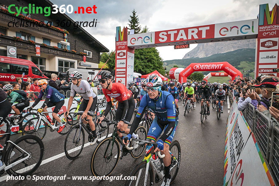 Pronti via, alle 6,30 in punto si parte, con Paolo Mutton, speaker ufficiale della Maratona dles Dolomites. Le vette del Gruppo Sella sono ancora immerse nelle nuvole colorate dal rosa della luce dell’alba. Il serpentone si muove alla volta di Corvara per poi allungarsi sulle rampe del Campolongo: è questa la foto magica della Maratona dles Dolomites, a cui si aggiungono le immagini mozzafiato riprese dalle telecamere Rai attraverso gli elicotteri che sorvolano i cieli dell’Alta Badia per la lunga diretta di sei ore che ogni anno va in onda sulla RAI. Nelle salite si ha anche il tempo di guardarsi intorno, potrebbe sembrare di sognare, ma non è così, il panorama che si apre di fronte ai nostri occhi, specialmente alle prime luci dell’alba (il momento più bello), è tutto reale ed è quello che ci mostra un vero paradiso terrestre.