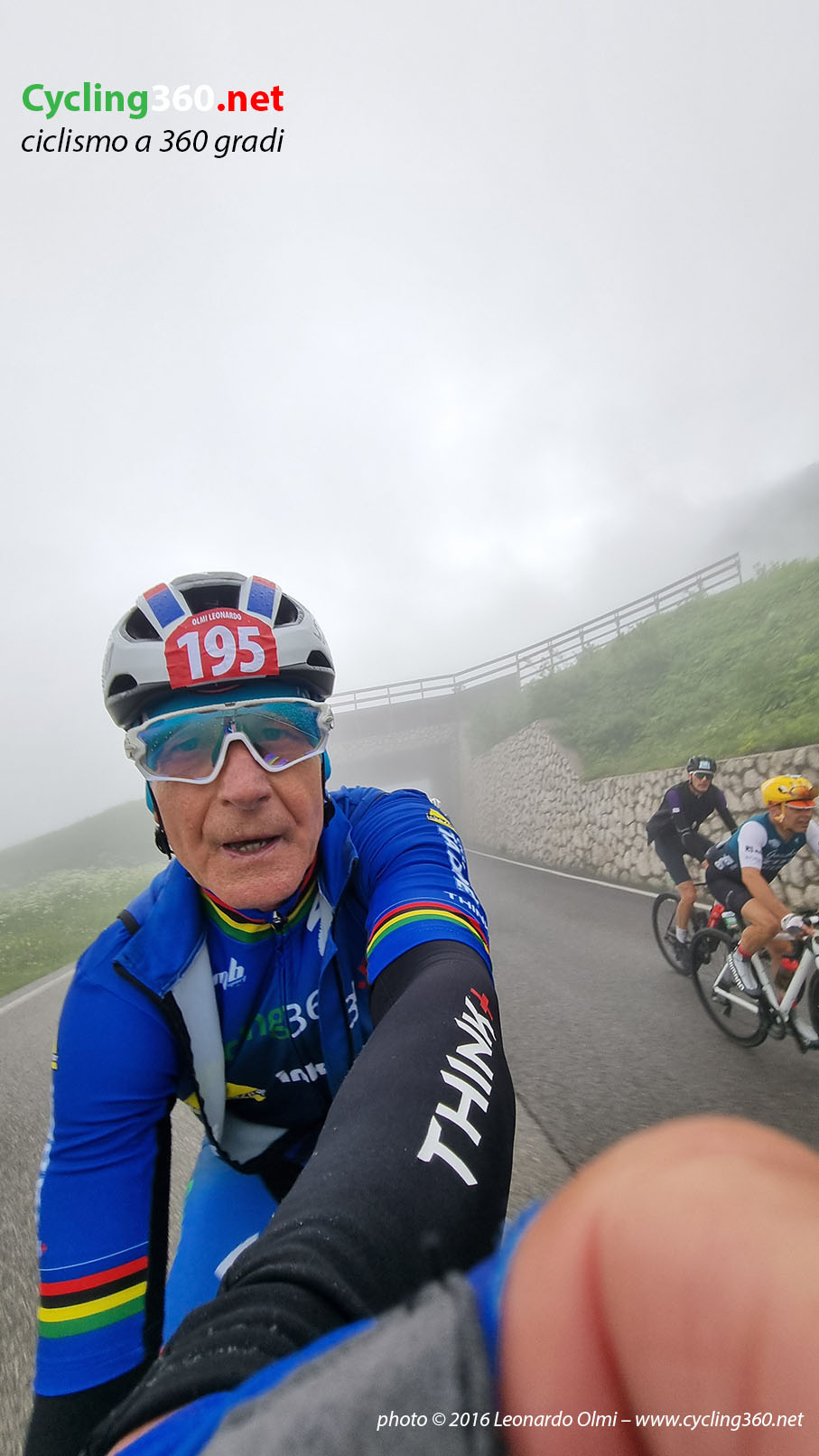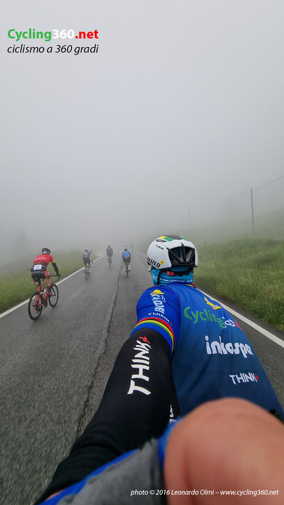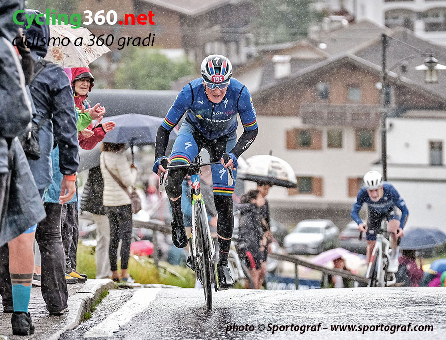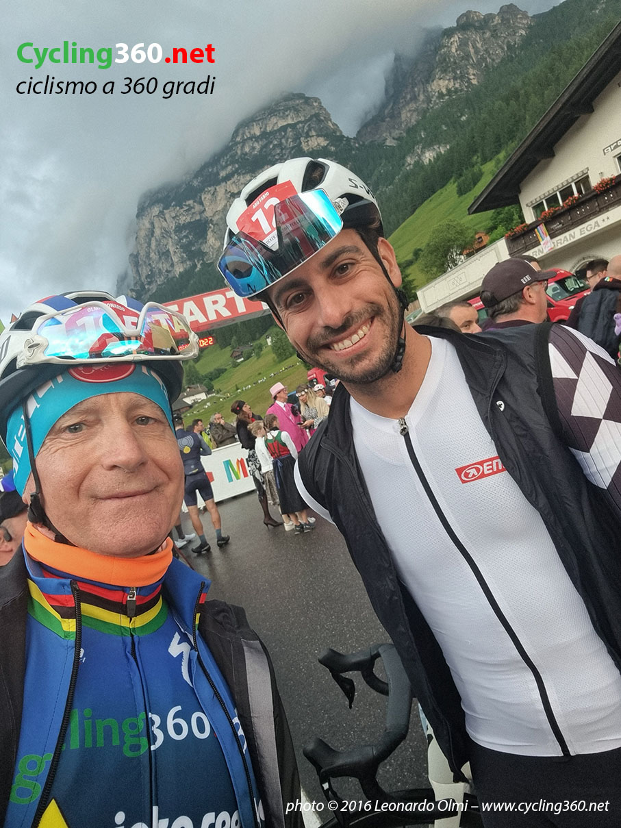 Ma presto dovrò lasciare il comfort della mia camera e la tavola imbandita da gustosi dolci compromettenti per salire in sella alla mia bici. È il momento della vestizione, con il dubbio di cosa indossare; quindi gonfio i tubolari, prendo borracce, gel e barrette della Inkospor (mio sostenitore personale per l’integrazione alimentare) ed esco dall’albergo, pronto a salire in bici ed affrontare il fresco delle basse temperature (12°C) unite alla discesa fino a La Villa, che quest’anno è pure bagnata a causa della pioggia caduta copiosa nella notte. Per fortuna qualcuno ha inventato (chissà come e chissà quando) di indossare quelle tute da imbianchino bianche, che fungono da antivento, ottimo ed economico (dai 2 ai 5 euro), un “usa e getta” molto utile.