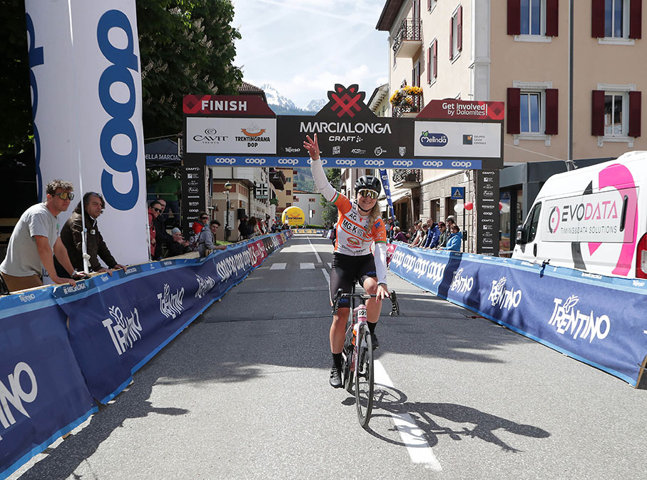 Al femminile fra salite, discese, prati e pascoli nella narrazione della granfondo si è inserita Annalisa Prato: la cuneese ha patito i crampi fin dal rientro verso Predazzo dopo il Passo Pampeago, ma con tenacia e determinazione ha lottato per completare la sua prova: “ci tenevo moltissimo a fare il percorso granfondo e ho stretto i denti. Voglio dedicare la vittoria alla mia nutrizionista e migliore amica Samantha, che ora è ferma ai box per infortunio, ma non vedo l’ora di riaverla al mio fianco in bicicletta!” Seconda e terza piazza, molto staccate, rispettivamente per l’everesting-girl Sarah Palfrader e Manuela Elisabeth Beer.