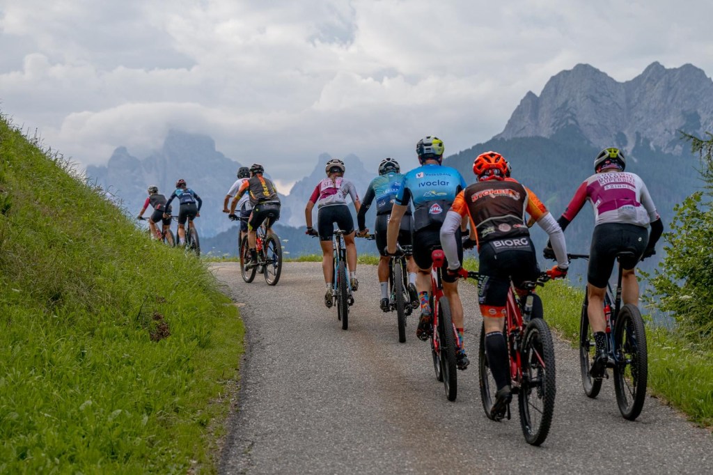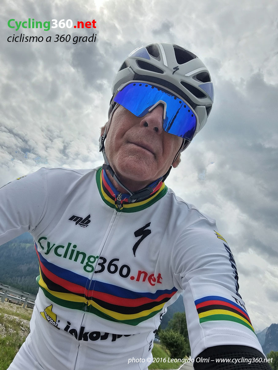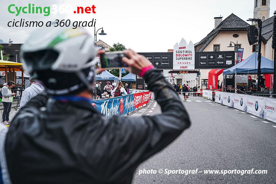Quindi, la mattina della gara, faccio anch’io un’abbondante colazione che mi servirà per affrontare i quasi 1800 metri di dislivello, metto in tasca barrette e gel della Inkospor, mio sostenitore personale per l’integrazione alimentare, esco di camera e mi dirigo in griglia dove posiziono la mia bici per poi andare a fare subito qualche scatto ai professionisti delle ruote grasse. Nella mia borsa sotto sella non può mai mancare la mantellina prodotta da Think+, poiché anche se le previsioni sono buone sui passi dolomitici non si sa mai cosa può succedere. Indosso anche l’antivento della mia divisa personalizzata prodotta da MB Sport di Agliana (PT) a cui abbino l’intimo ed i manicotti che la stessa azienda produce sempre con marchio Think+. Sia la mantellina che l’antivento di Think+ sono prodotto da MB Sport con materiale performante, leggero, ma molto funzionale e versatile, confortevole e tecnico allo stesso tempo, che si possono anche ripiegare e tenere comodamente in tasca.