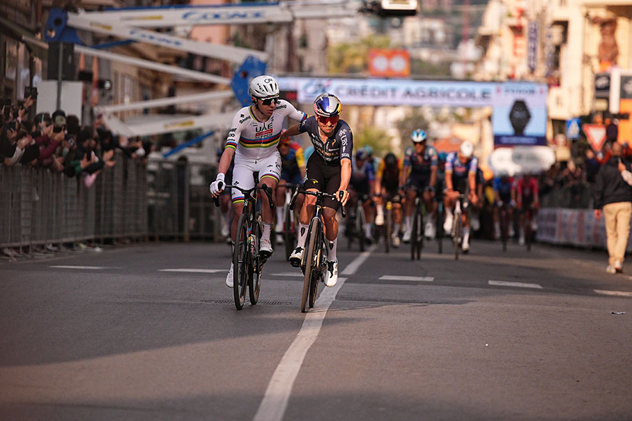 Lo sloveno è risalito in sella, rientrando rapidamente in gruppo e, supportato da Brandon McNulty e Isaac Del Toro, ha lanciato il suo primo attacco proprio nella seconda parte della Cipressa, un’azione alla quale hanno reagito solo Pidcock e Van der Poel. Sul Poggio il terzetto di testa si è ridotto a un duo: Van der Poel infatti non è riuscito a reggere il passo dei compagni d’avventura. Giunti in coppia in Via Roma, Pogacar e Pidcock si sono giocati la vittoria allo sprint, con il campione del mondo che ha lanciato la sua volata ai 300 metri, imponendosi sul rivale britannico per pochi centimetri. Terzo a 4”, Wout Van Aert ha anticipato il gruppo inseguitore, la cui volata è stata vinta da Mads Pedersen, con Corbin Strong a chiudere la top 5.